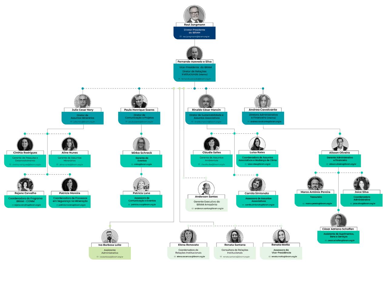Para auxiliar o trabalho da Diretoria Executiva, o IBRAM dispõe de uma equipe técnica de alta competência em temas relacionados ao setor mineral. Conheça o organograma do IBRAM:
